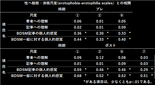 相関を見ると性への積極-消極尺度と,BDSMに対する感覚との間に有意な相関が認められた。したがって,BDSMに対する態度は,性への積極-消極的傾向という性格傾向に影響を受ける。